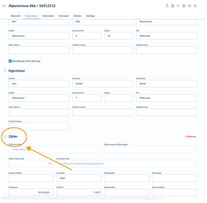 Im Reiter „Stammdaten“ können nun alle Felder, zur Anlage von Kunden- und Zählerstammdaten, ausgefüllt und anschließend über den Button „Speichern“ abgespeichert werden. Diese Daten können jederzeit über diesen Reiter bearbeitet werden.