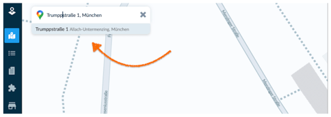 Sollten Sie den neuen Standort auf der tablano Karte nicht finden, wählen Sie das Symbol „Koordinaten bearbeiten“ und geben Sie anschließend die gewünschte Adresse im Google-Suchfeld links oben ein. Die tablano Karte springt daraufhin an die gesuchte Adresse. Klicken Sie jetzt auf die Karte, an der er exakt platziert werden soll. Um die Position zu bestätigen, klicken Sie auf die Speichertaste.