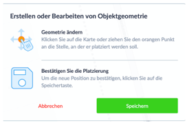 Klicken Sie auf die Karte oder ziehen Sie den orangefarbenen Punkt, der nun unterhalb Ihres POIs erscheint, an die gewünschte Stelle, an der das Objekt zukünftig platziert werden soll. Um den neuen Standort des Objektes zu bestätigen, klicken Sie auf die grüne Speichertaste.