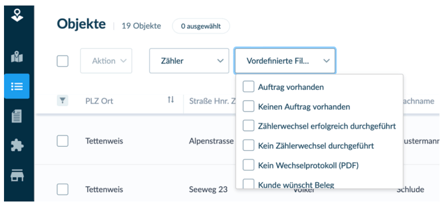 Auch vordefinierte Filter stehen Ihnen im Dropdown-Menü über den Spalten der Objektliste zur Verfügung.