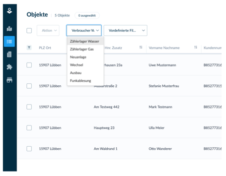 Das virtuelle Zählerlager können Sie in der Objektliste im Desk über das Dropdown-Menü auswählen.
